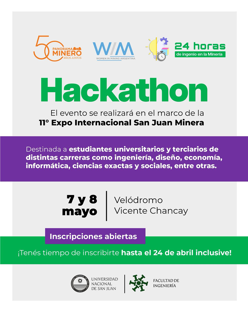24 horas de ingenio en la Minería es una competencia interdisciplinaria fusionada con un bootcamp corto y está destinada a estudiantes universitarios y terciarios de la Provincia de San Juan de distintas carreras como ingeniería, diseño, economía, informática, ciencias exactas y sociales, entre otras. El objetivo principal del evento es brindar un espacio donde estudiantes de diversas disciplinas puedan colaborar en equipo y aplicar sus conocimientos para enfrentar desafíos reales propuestos por empresas y organizaciones del sector minero.