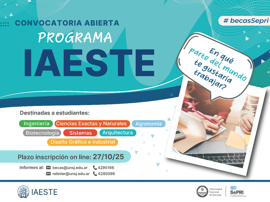 La Secretaría de Posgrado y Relaciones Internacionales (SEPRI) de la Universidad Nacional de San Juan informa que se encuentra abierta la convocatoria para el Programa IAESTE 2025 (International Association for the Exchange of Students for Technical Experience).