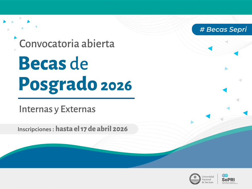 La Secretaría de Posgrado y Relaciones Internacionales (SEPRI) de la Universidad Nacional de San Juan (UNSJ), con acuerdo del Consejo Asesor de Estudios de Posgrado (CAEP), informa que se encuentra abierta la Convocatoria a Becas Internas y Externas de Posgrado 2026.