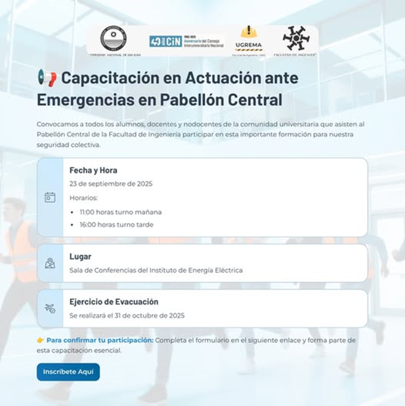 La actividad es el 23 de septiembre, en la Sala de Conferencias del Instituto de Energía Eléctrica a las 11 para el turno mañana y a las 16 para el turno tarde. El ejercicio de evacuación será el 31 de octubre de 2025.